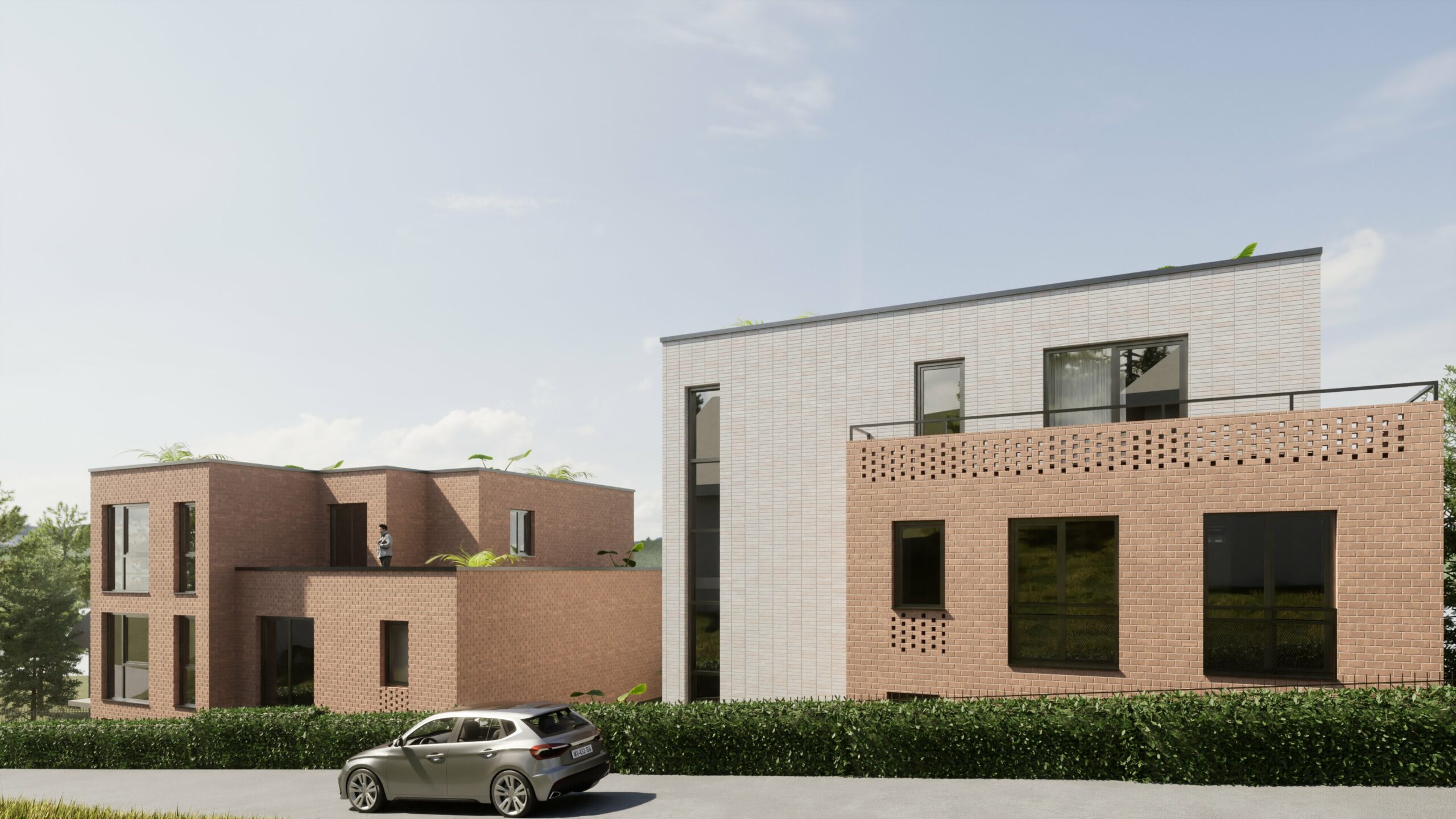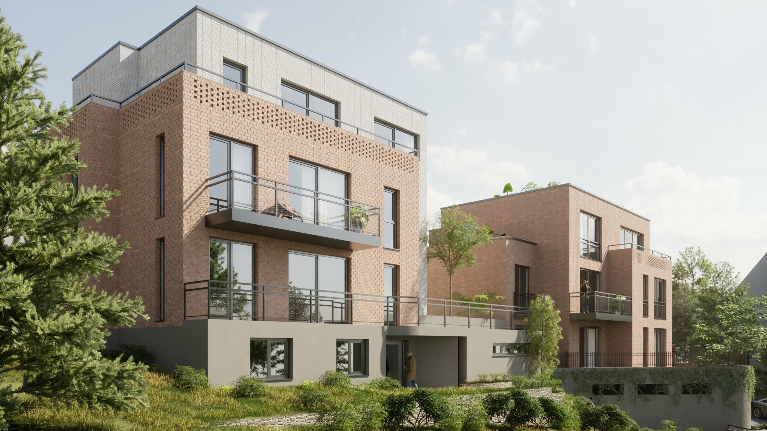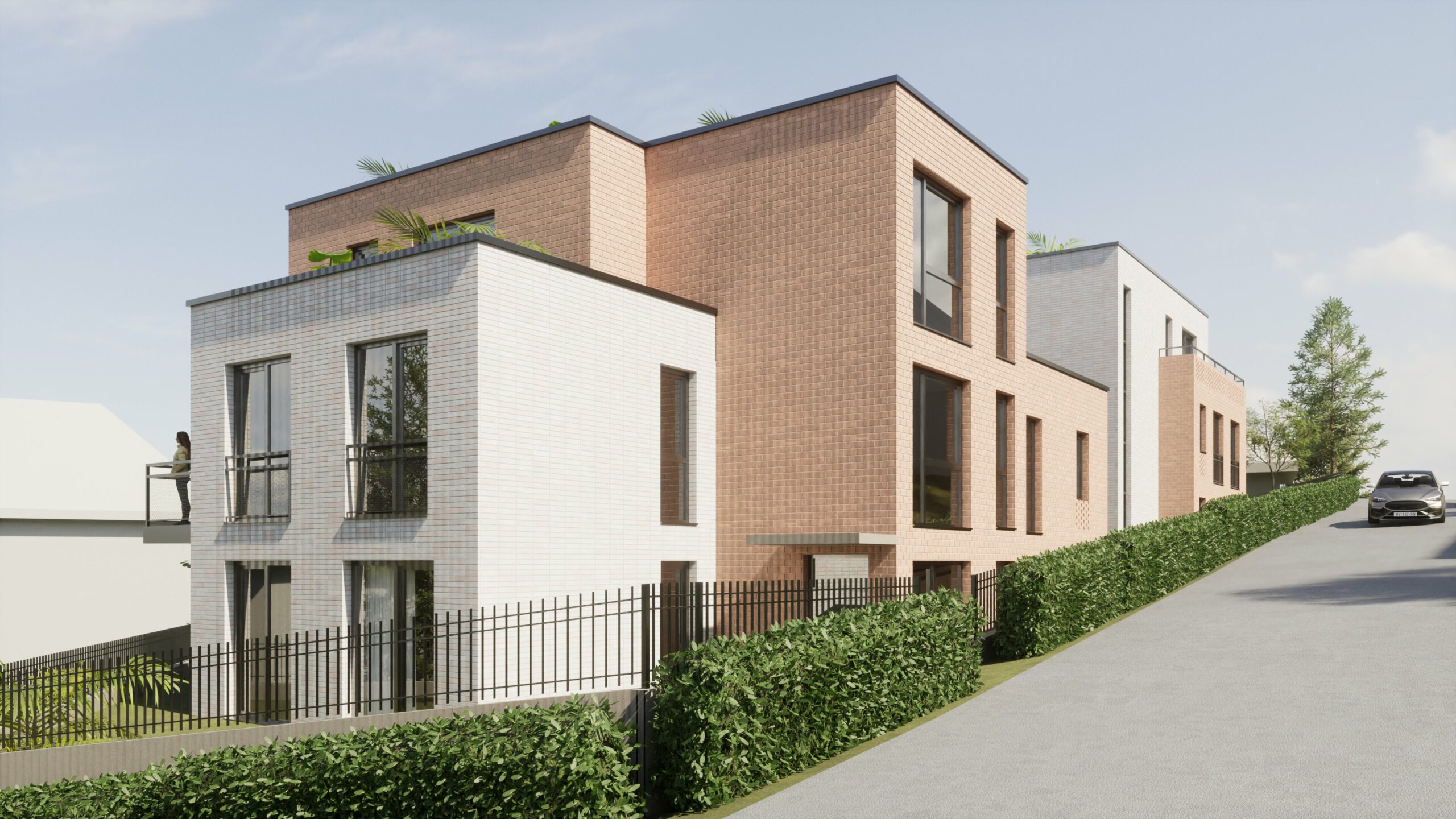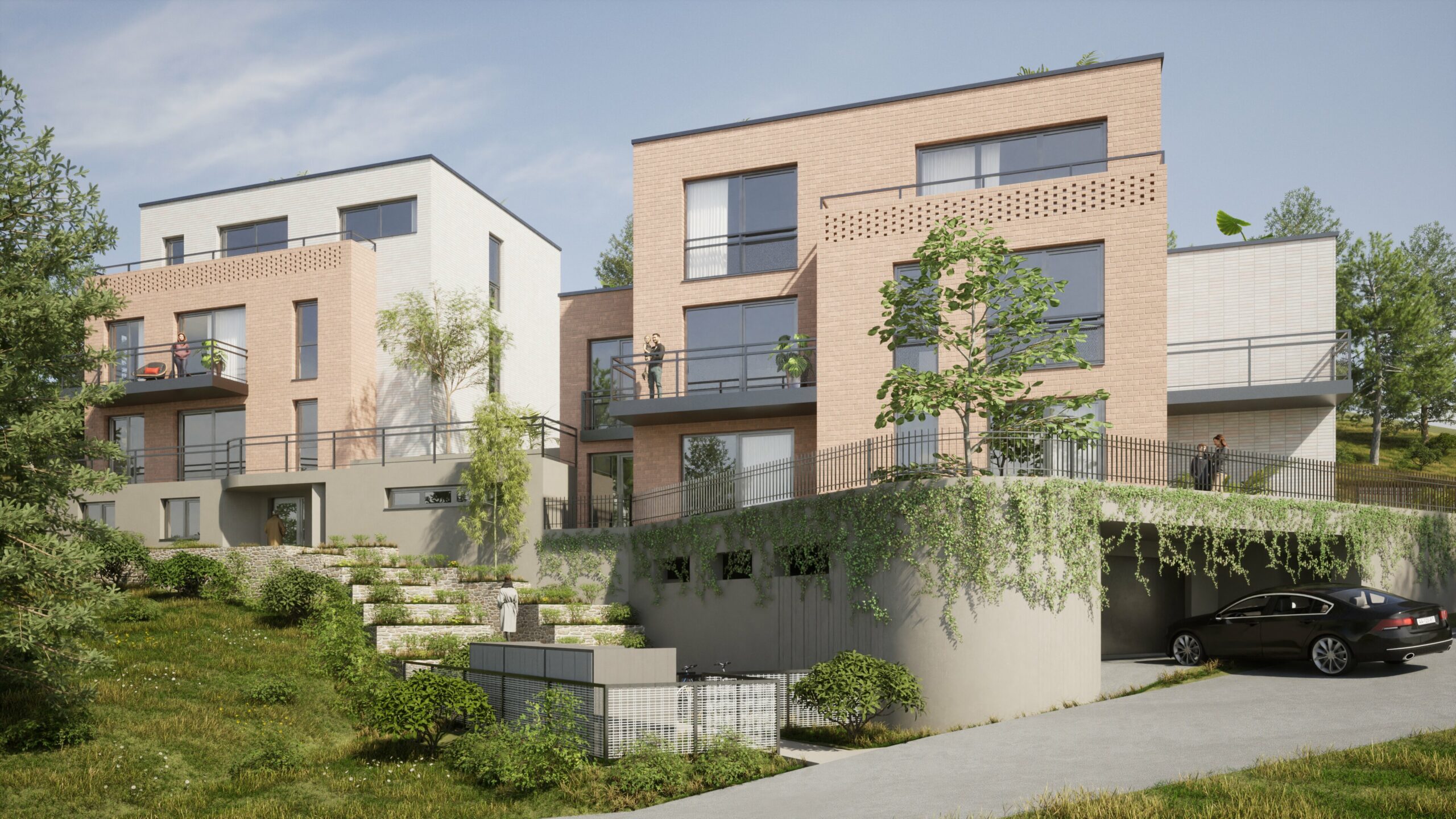 Das Projekt umfasst drei zusammenhängende Grundstücke mit einer Gesamtfläche von 938,57 m². Darauf werden zwei Baukörper errichtet, die auf einer gemeinsamen Tiefgarage stehen und sich durch einen Höhenversatz von 2,20 m optimal an das bis zu 8 m abfallende Gelände anpassen.