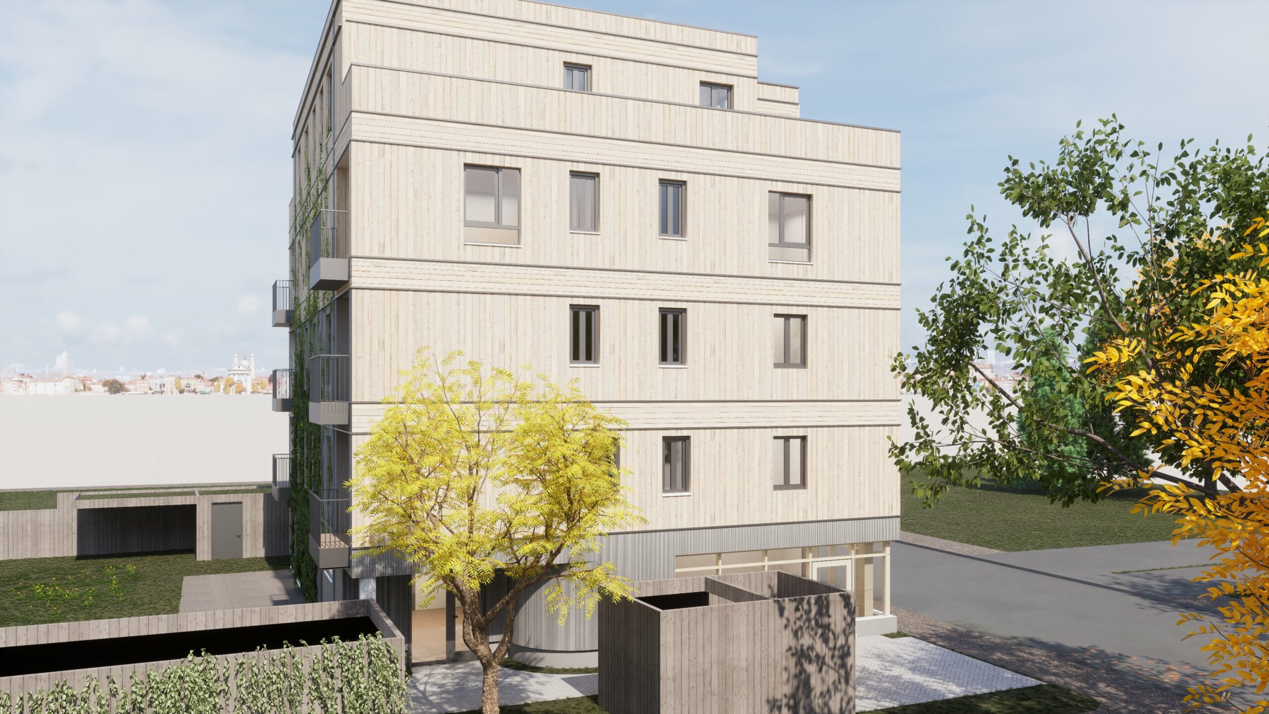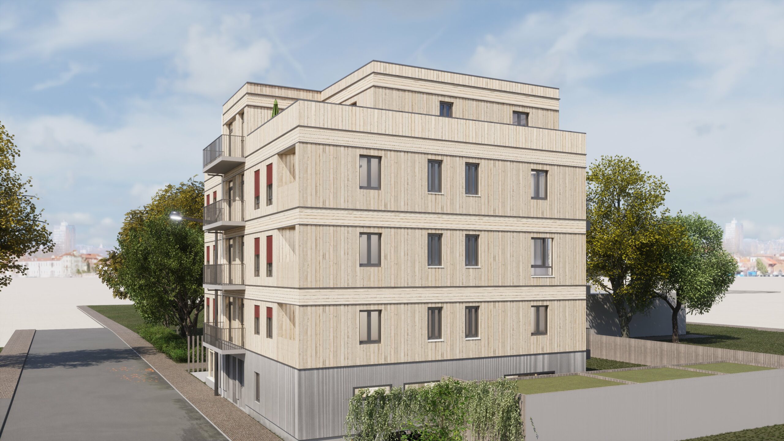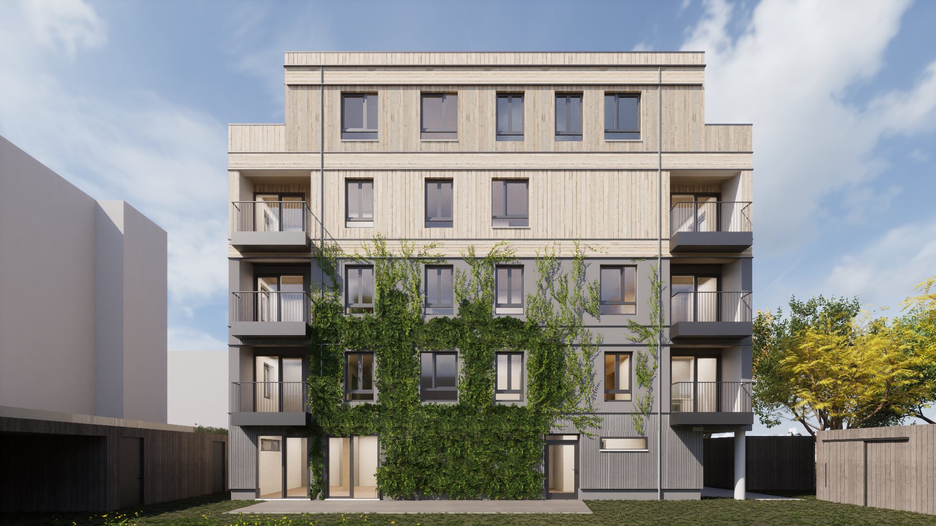Die verschiedenen Wohnungstypen werden allesamt mit einen Balkon/ Loggia ausgestattet. Das Staffelgeschoss verfügt über eine großzügig gestaltete Dachterrasse. Gleichzeitig werden die oberen Dachflächen extensiv begrünt und wesentliche Fassadenbereiche mit einer Fassadenbegrünung versehen.